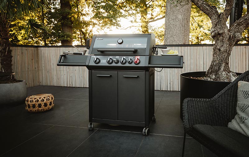 Barbecue à gaz en acier inoxydable avec 4 brûleurs puissants réglables. Idéal pour une cuisson précise et performante en extérieur